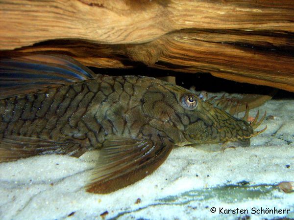 Der Ancistrus sp. "L 486" stammt aus dem Einzugsgebiet des RÃ*o Caura in Venezuela. Er ist eine recht klein bleibende Ancistrusart, bei der die Männchen ein ausgeprägtes Tentakelgeweih entwickeln. Als Jungtiere zeigen sie noch einen leicht rötlichen Saum, der im Alter aber, wie bei diesem adulten Männchen, gänzlich verschwindet. ![]() Ancistrus sp. "L 486" Gruß Ralf |