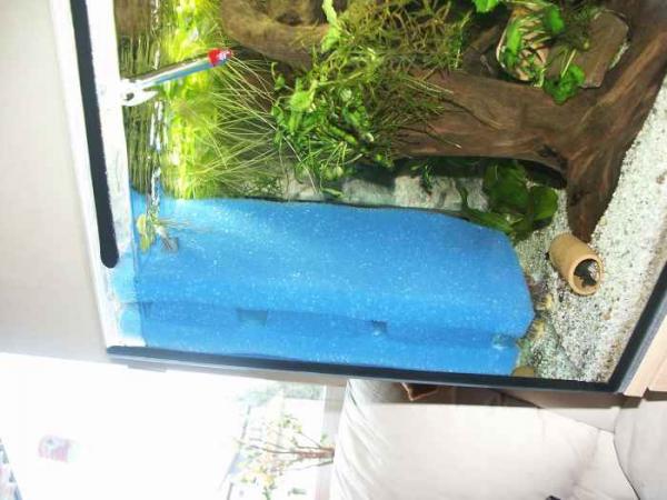 Das rechts ist ein Abteil mit ca. 15l. Für Aufzucht von Jungtieren (falz mal was nicht Welsiges anliegt). Links soll das ein Doppelabteil mit 1x ca. 70l und 40l (1x Haltung und 1x Aufzucht bei gleichem Wasser), dass durch die Doppelmatte geteilt ist, werden. Leider muss ich mich Platzmäßig etwas einschränken. 1m Becken währen mir lieber gewesen. Leider habe ich in meinem kleinen Kellerraum nur eine 90cm breite Ecke frei.