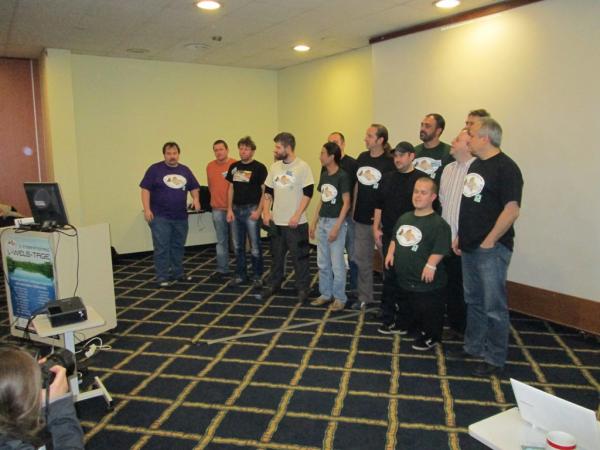 ich nehme an dass Sandor darauf anspielt dass die Vorträge überzogen wurden und sich somit alles etwas in die Länge gezogen hat, was besonders am Abreisetag nach dem letzten Vortrag ein Gruppenfoto extrem erschwert!