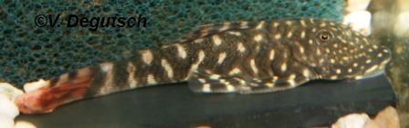 Sonstiges: Erstmals im Frühjahr 2011 von Aquarium Glaser importiert. Eine überaus attraktive Art, die auf dunkelbraunem Grund hellgelbe Flecken und Punkte zeigt. Die Caudale ist orange-rot gefärbt, jedoch ist der obere Teil der Schwanzflosse durchsichtig.
