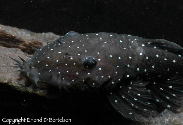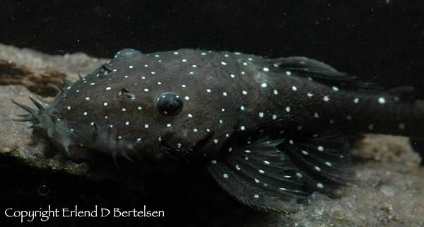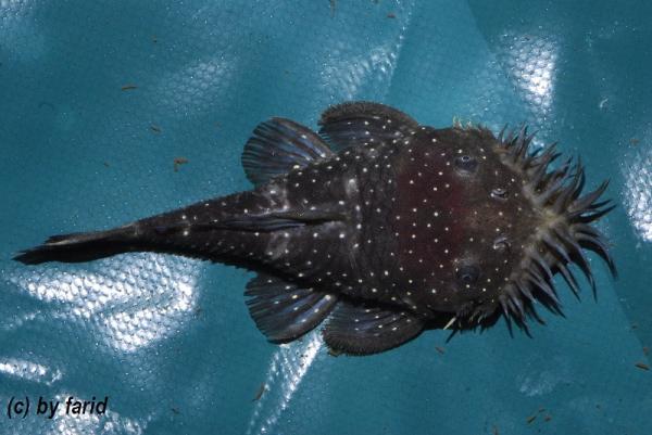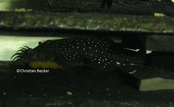 Beschreibung: Die sehr flache Körperform entspricht der von Ancistrus ranunculus. L 255 bleibt offenbar etwas kleiner als diese Art und hat eine attraktive Zeichnung mit weißen Punkten auf dem schwarzen Körper und Flossen (bei der Caudale nur in der vorderen Hälfte). Ein relativ kräftiger Schwanzstil endet in einer relativ kurzen Caudalen. Bis auf wenige Punkte und die beiden Hartstrahlen mit weißen Enden ist die Caudale schwarz.
