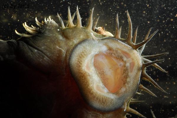 Interopercular-Odontoden. Diese befinden sich in eingeklapptem Zustand hinter den Kiemendeckeln.